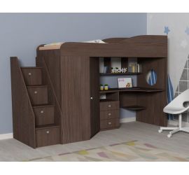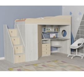 Второй вид кроватей-чердаков рассчитан на возраст детей от пяти лет. Спальное место в таком случае располагается на высоте 1,3-1,6 метра. На первом ярусе чаще всего есть шкаф и рабочая зона в формате письменного стола и книжных полок.